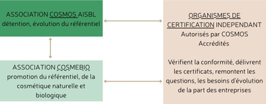 Schéma représentant le fonctionnement entre COSMOS, Cosmébio et les organismes certificateurs (Bureau Veritas, Cosmécert et Ecocert) :