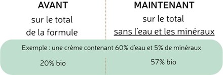 Le référentiel COSMOS fait évoluer sa méthode de calcul du pourcentage d’ingrédients biologiques : désormais, l’eau et les minéraux – non certifiables par nature – sont exclus du calcul. Cette nouvelle approche permet d’afficher un % bio plus représentatif de la teneur en ingrédients bio, facilite la comparaison entre produits et valorise les formules les plus engagées.